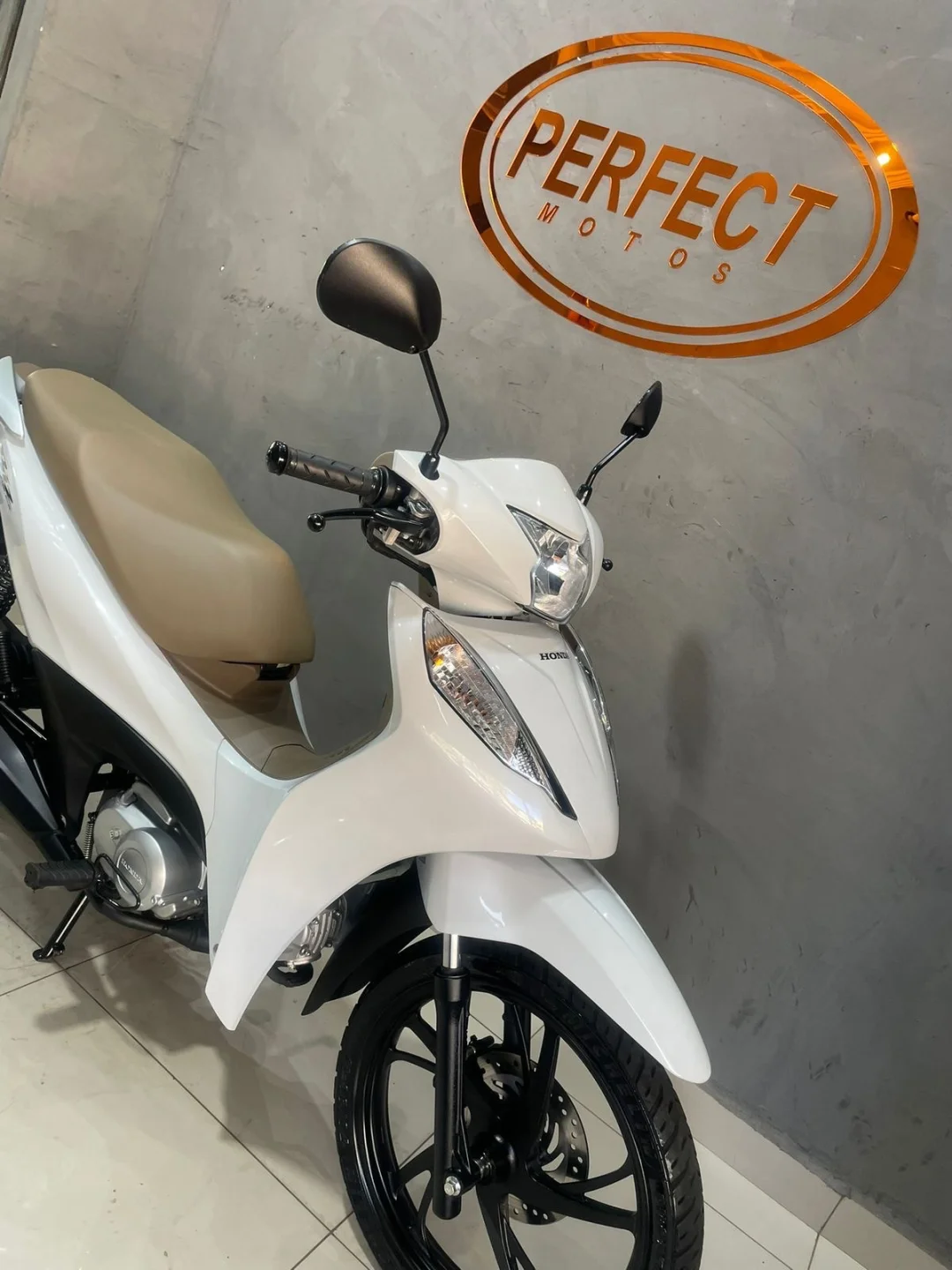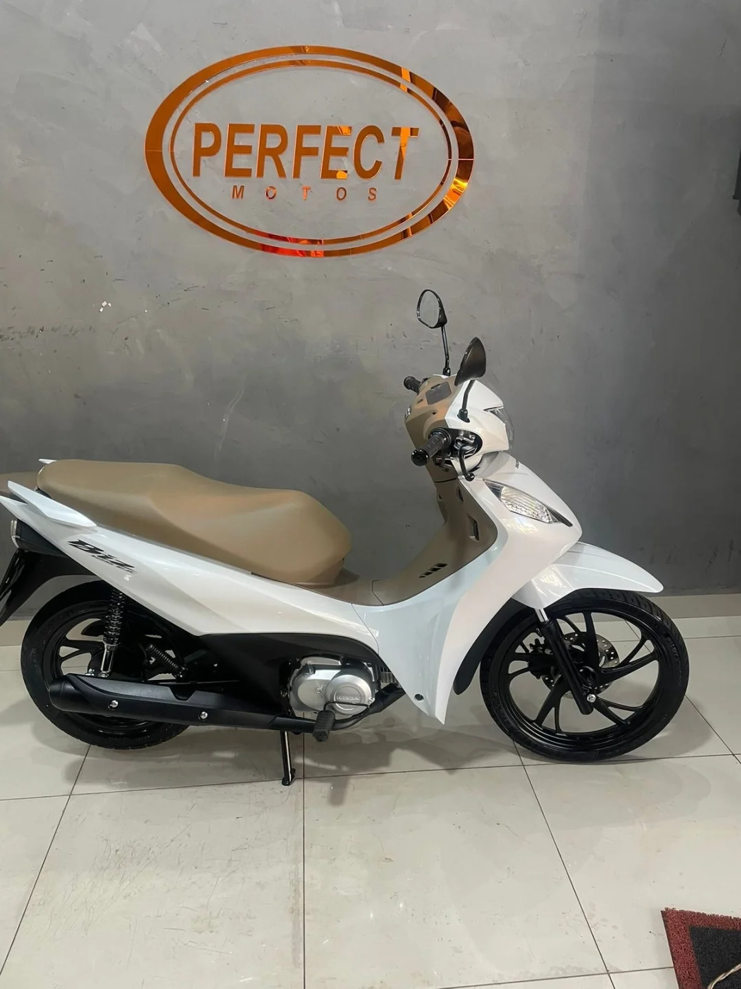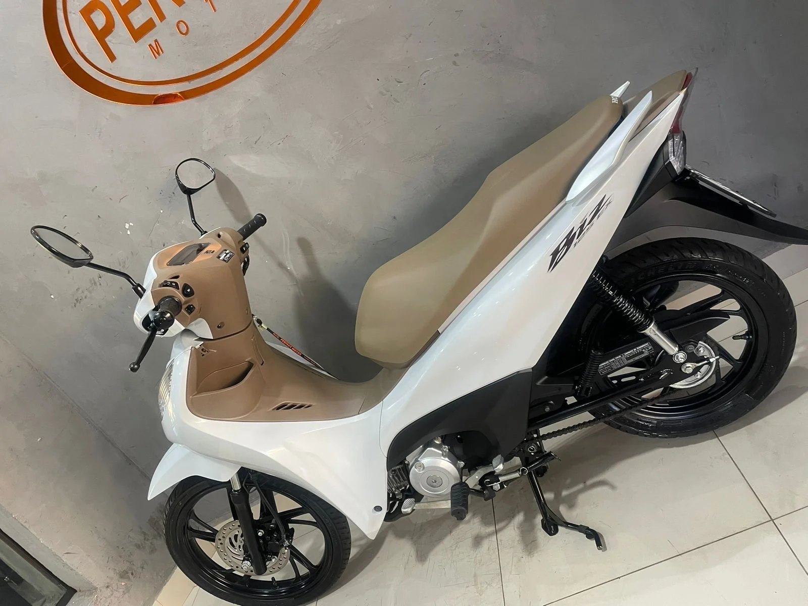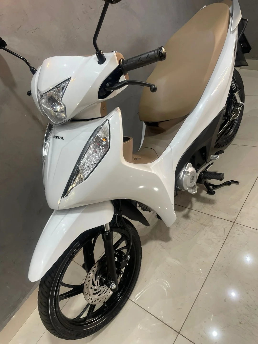Branquinha com banco caramelo, linda e super confortável — aquela moto perfeita pra quem quer economia, praticidade e estilo no dia a dia.