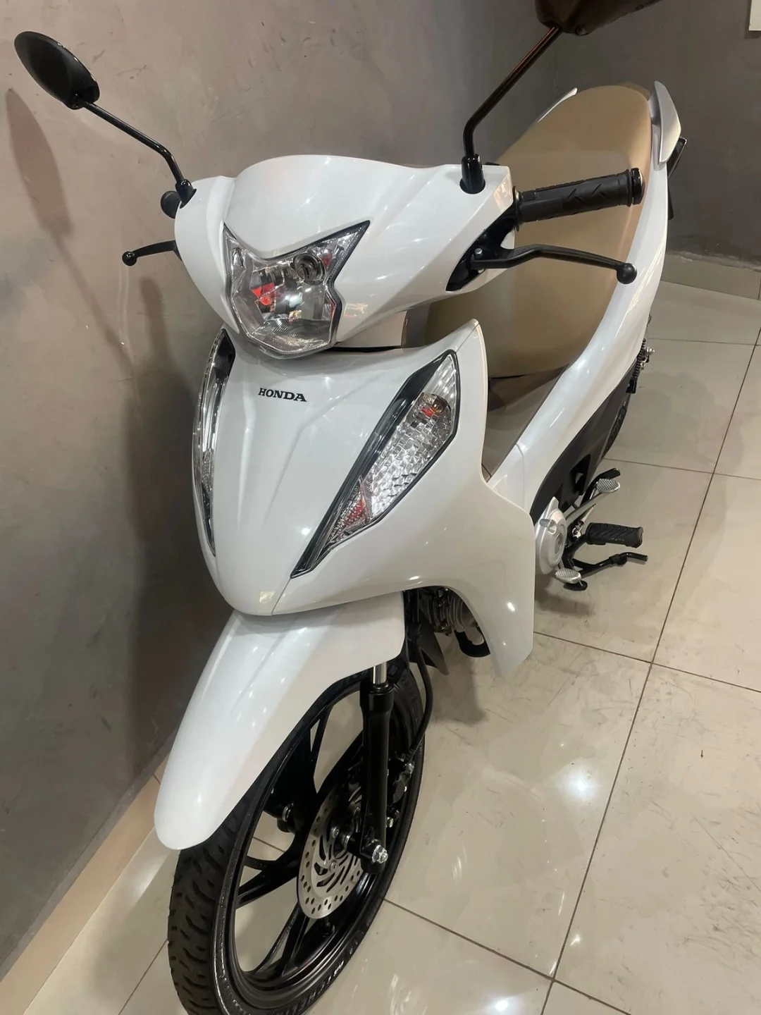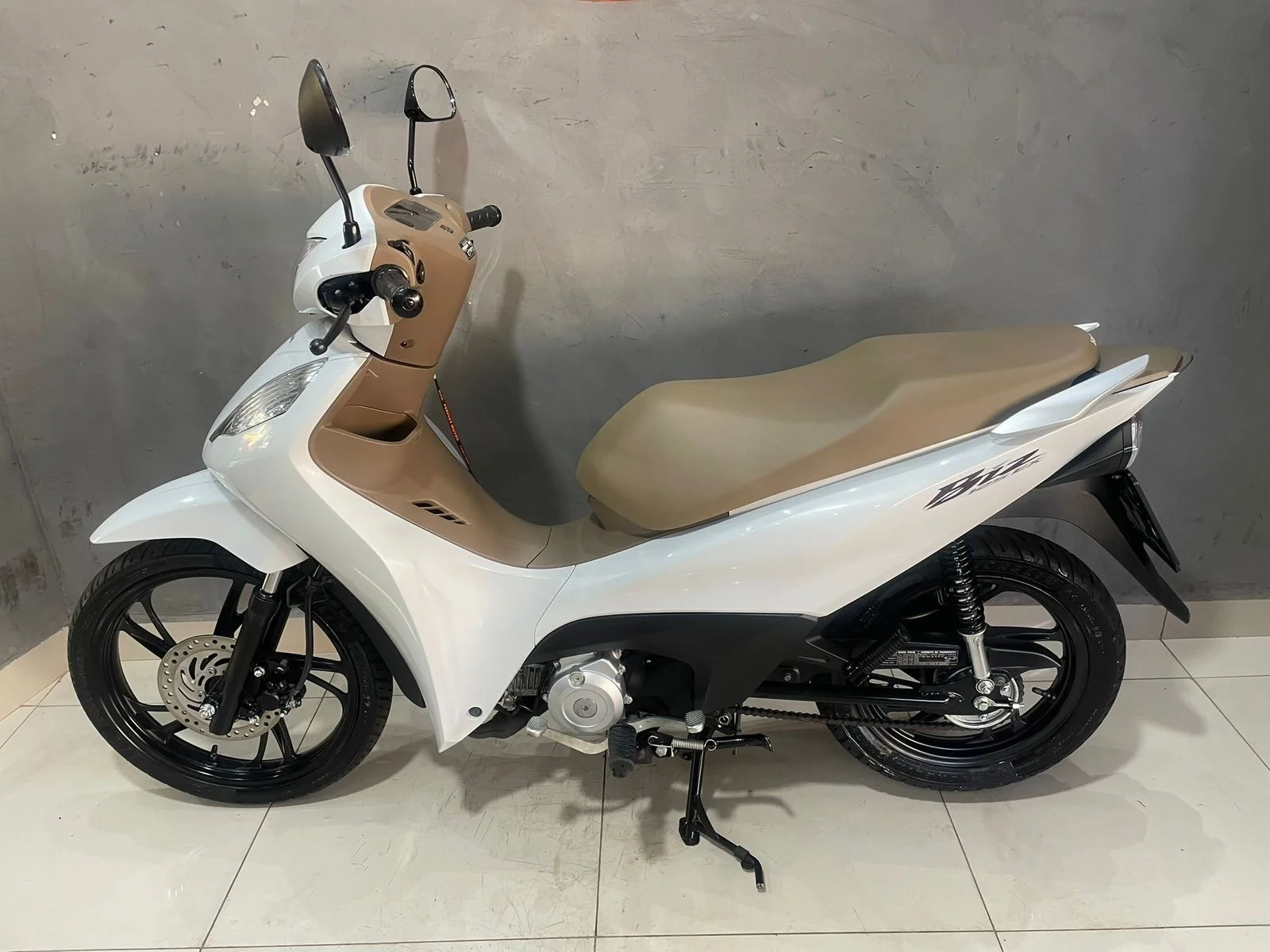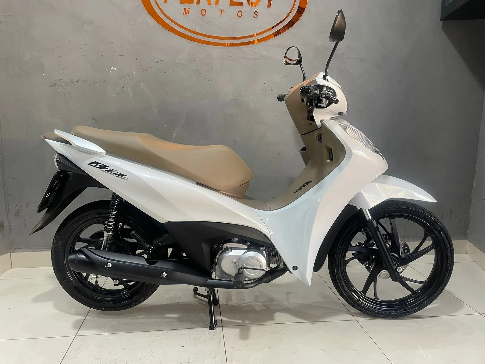 Branquinha com banco caramelo, linda e super confortável — aquela moto perfeita pra quem quer economia, praticidade e estilo no dia a dia.